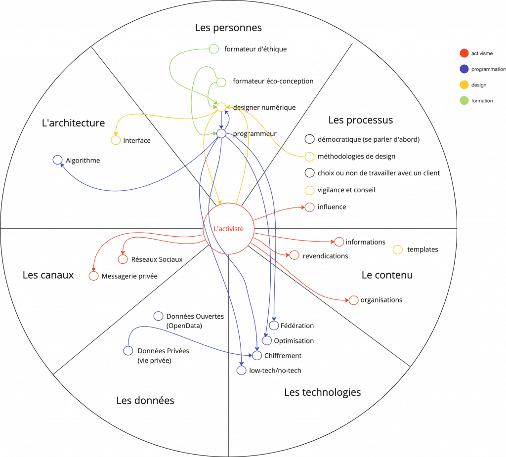 Dans cette cartographie, j’ai mis en avant les liens relationnel de l’activiste lorsqu’iel veut travailler avec des designers numériques.