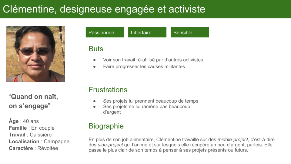 – Bonjour à toustes, je suis Clémentine. Je suis designeuse ainsi que militante féministe et anti-spéciste. J’adore quand mon travail sert une cause à laquelle je crois et je crois que il y en a assez du béton sur nos sols !