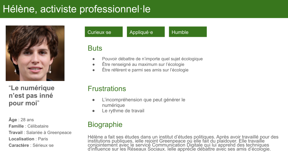 Ma réponse à la question ”Que peuvent faire les designers numériques pour les activistes écologistes ? » est la suivante : pour se mettre au service des activistes, le métier de designer doit évoluer et cela implique dans le cadre professionnel :