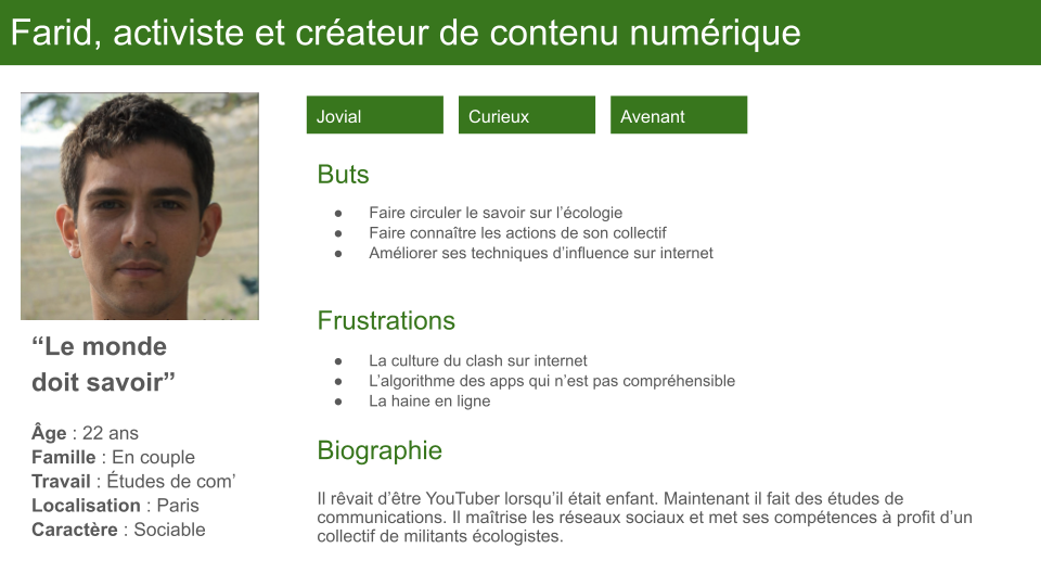 Farid est plus jeune. Marie l’a rencontré à un événement sur le climat. Il rêvait d’être YouTuber lorsqu’il était enfant. Maintenant il fait des études de communications et maîtrise les réseaux sociaux. Il veut utiliser cette corde à son arc pour créer du contenu pour l’association.